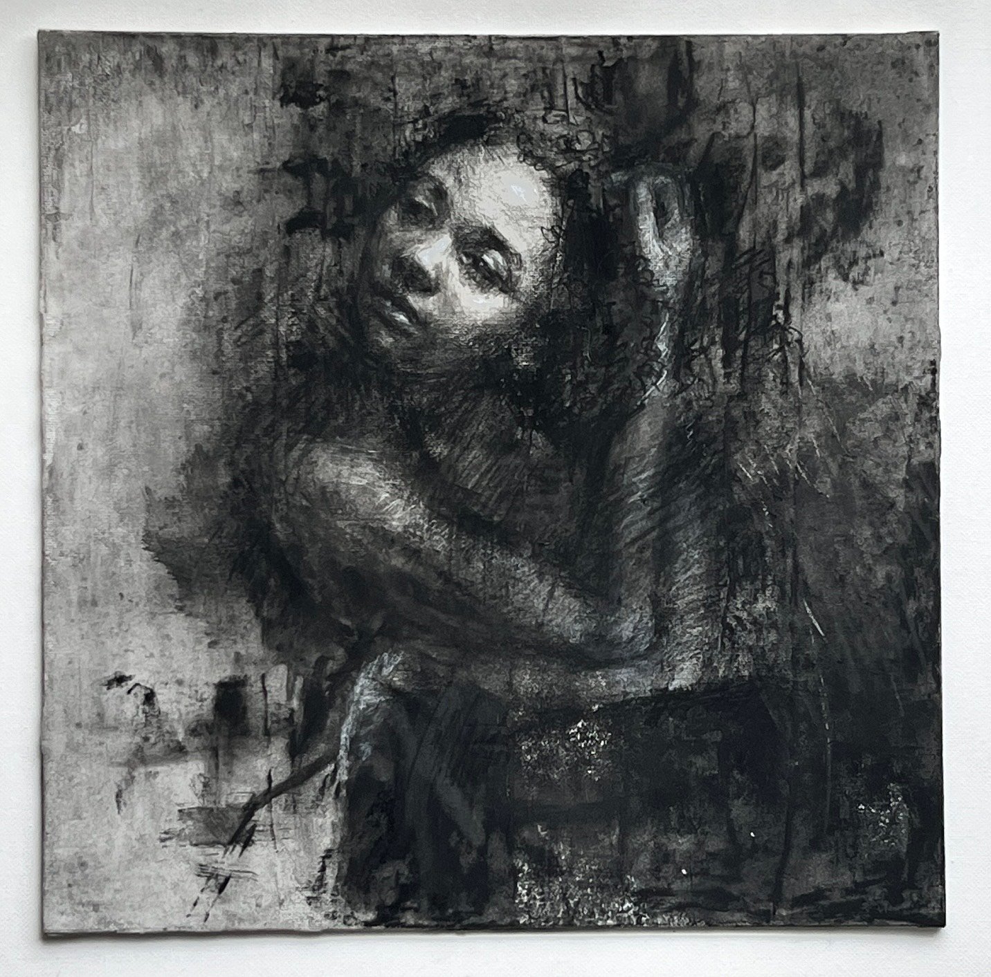 This evocative charcoal drawing captures the raw interplay of light and shadow, revealing a delicate yet haunting form emerging from the darkness. The textured strokes and layered tones create a sense of movement and emotion, as the figure gracefully pulls her hair to one side amidst a moody, atmospheric backdrop. This charcoal drawing is a testament to the power of monochromatic expression.